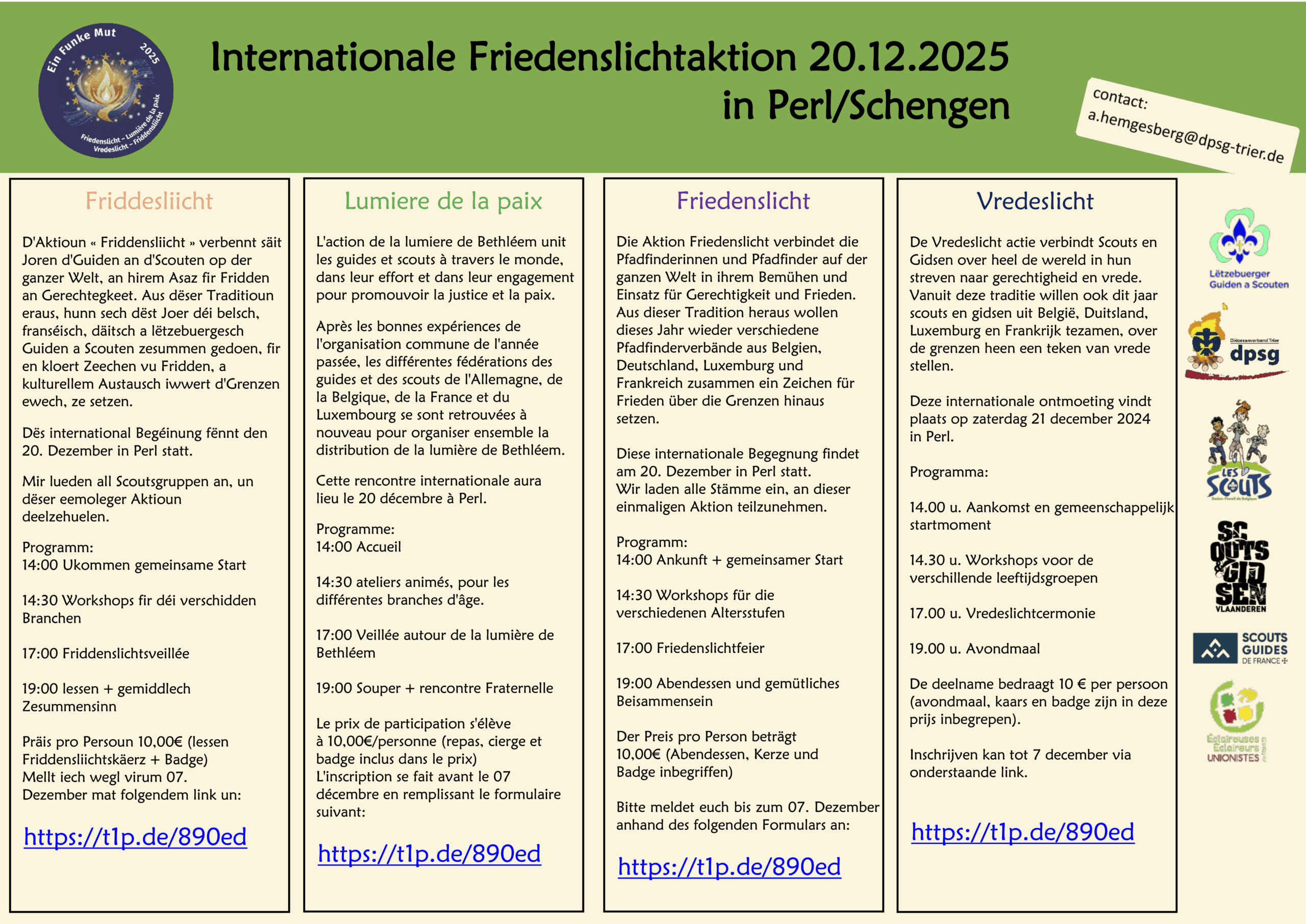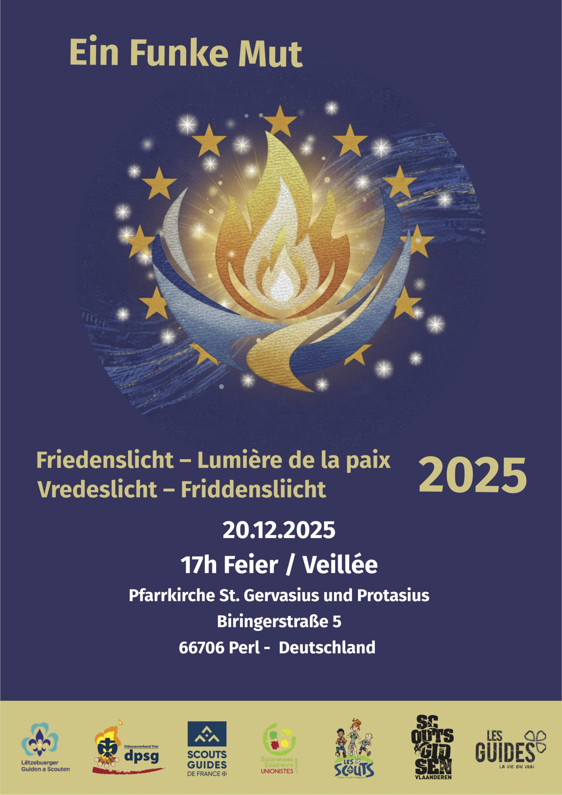202025DecFriddensliicht 202513:30Perl (D) an Schengen (L) Wann der nach wëllt Käerze bestellen, notzt w.e.g. dëse Formulär: Formulaire-Bestellung-FL-2025 Flyer-Friedenslicht_2025.v mat Link fir d’Umeldung dee klappt 😉